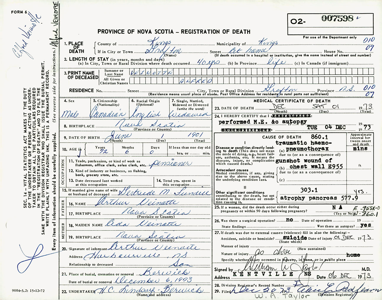 Male Death Registration: Year: 1973 number: 7598