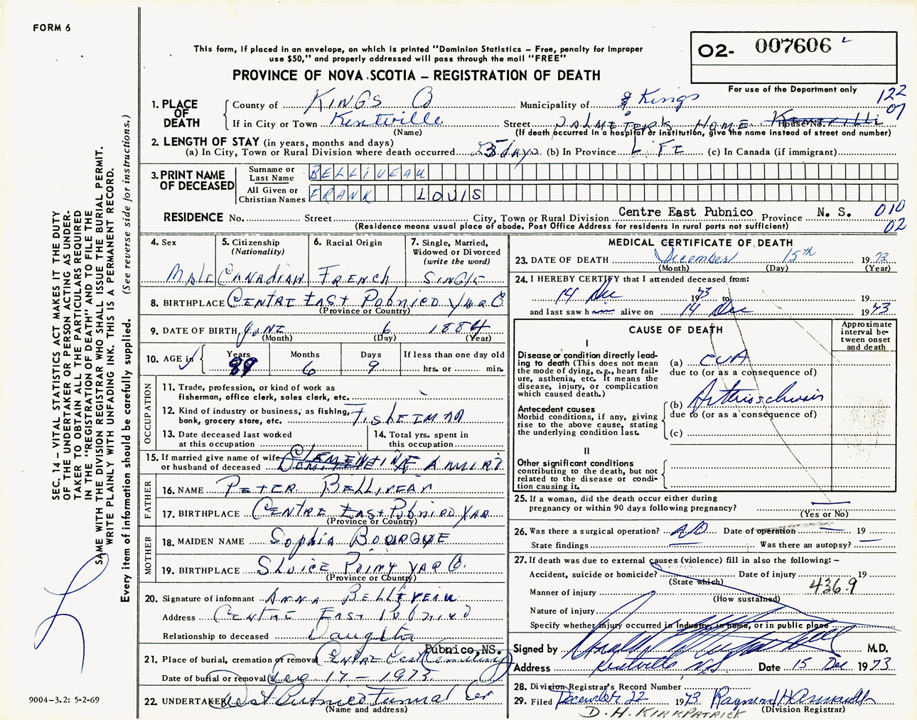 Male Death Registration: Year: 1973 number: 7606