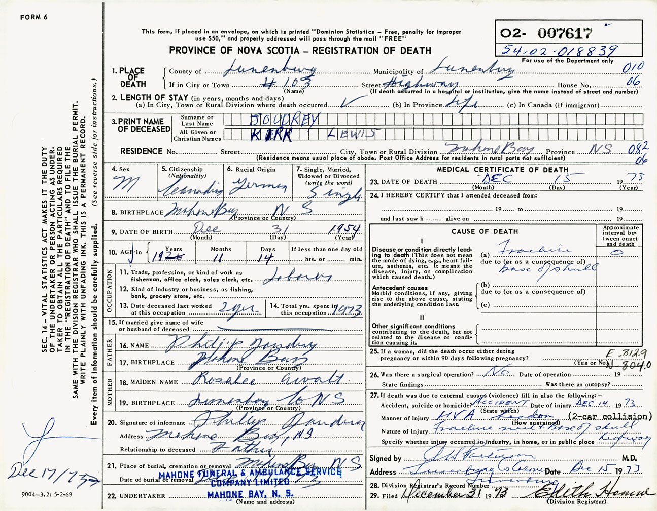 Male Death Registration: Year: 1973 number: 7617