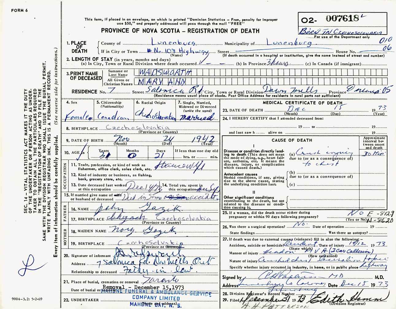 Female Death Registration: Year: 1973 number: 7618