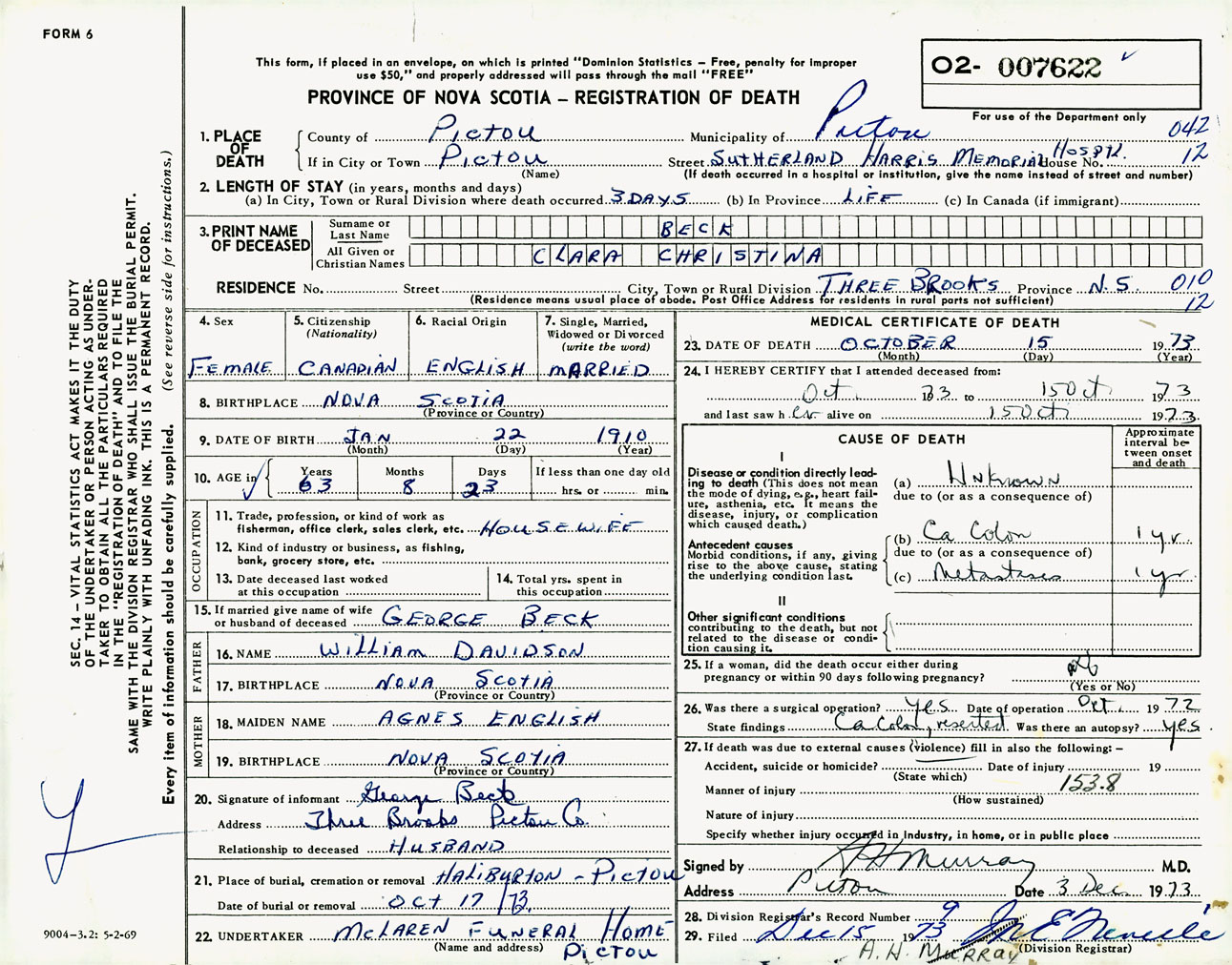 Female Death Registration: Year: 1973 number: 7622