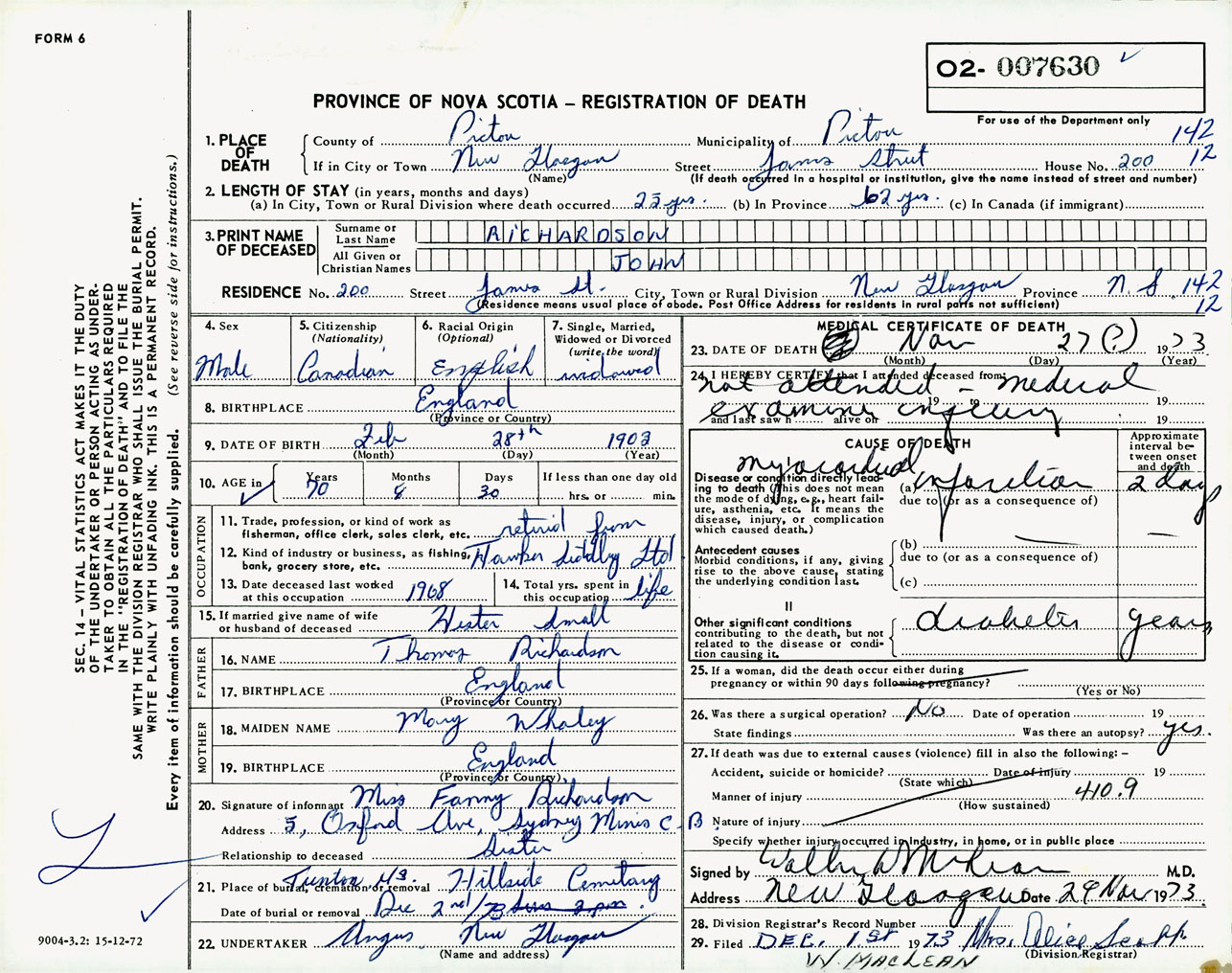 Male Death Registration: Year: 1973 number: 7630
