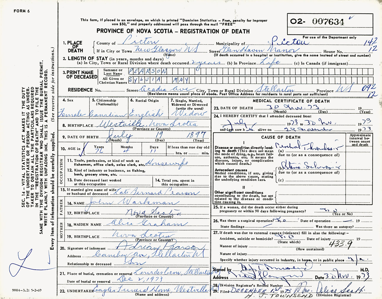 Female Death Registration: Year: 1973 number: 7634