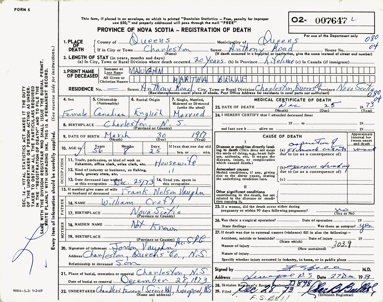 Female Death Registration: Year: 1973 number: 7647