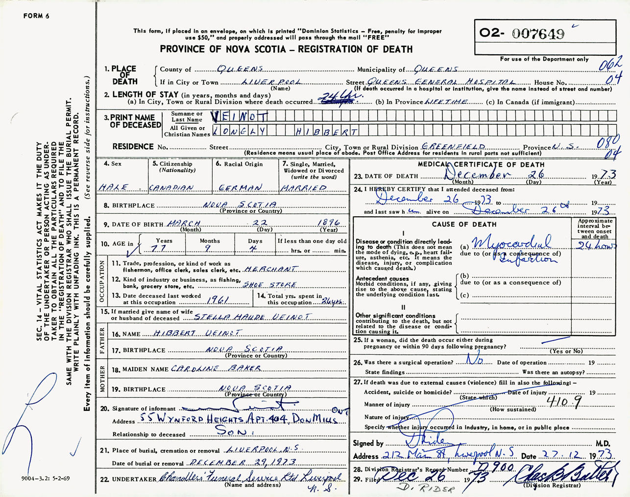 Male Death Registration: Year: 1973 number: 7649