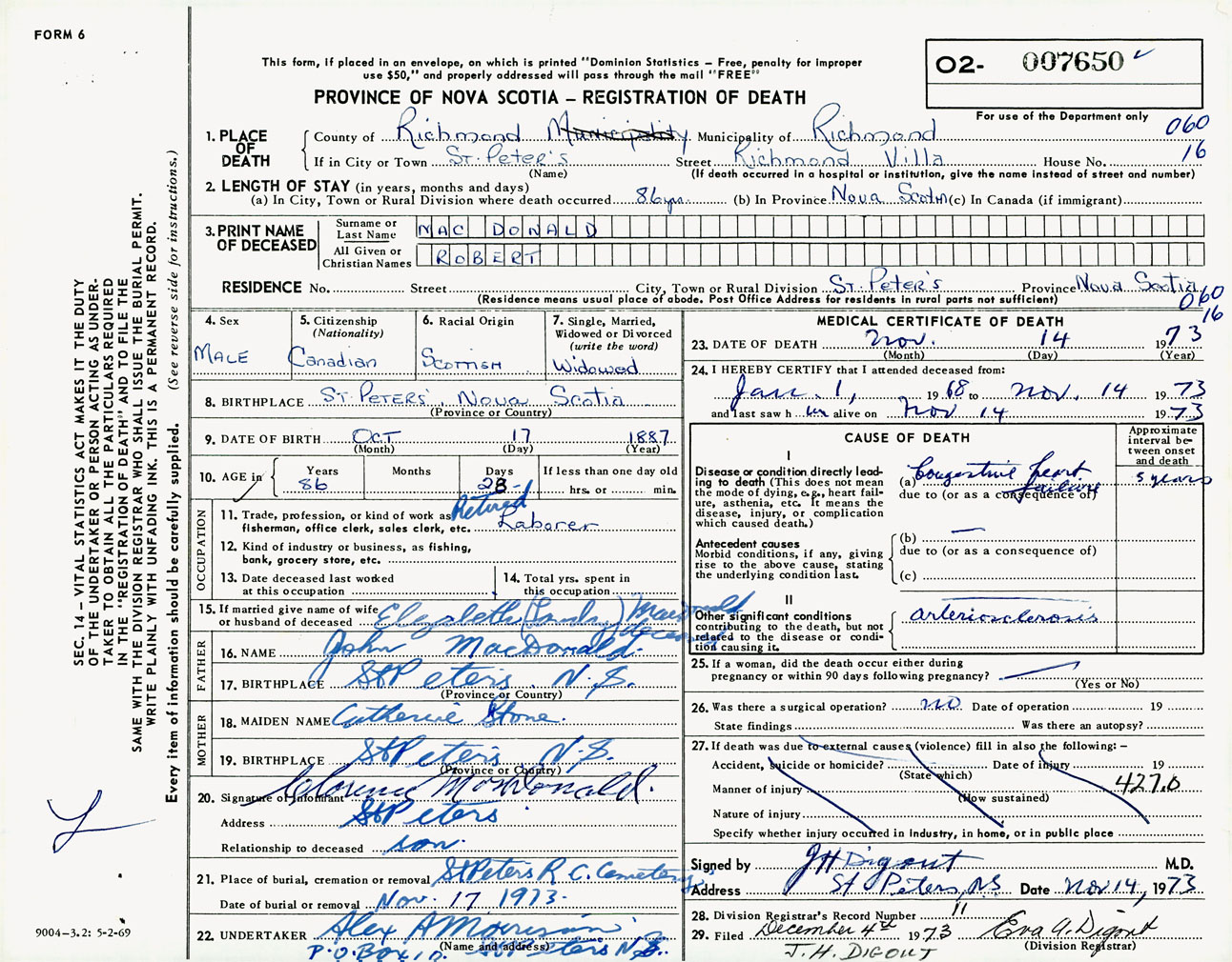 Male Death Registration: Year: 1973 number: 7650