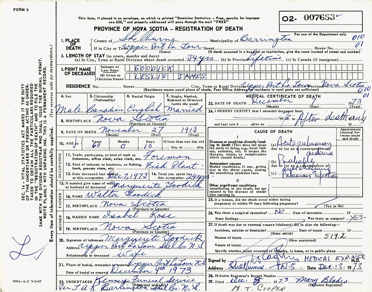 Male Death Registration: Year: 1973 number: 7653