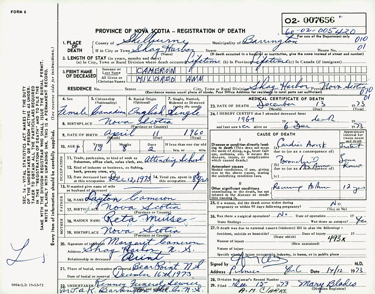 Female Death Registration: Year: 1973 number: 7656