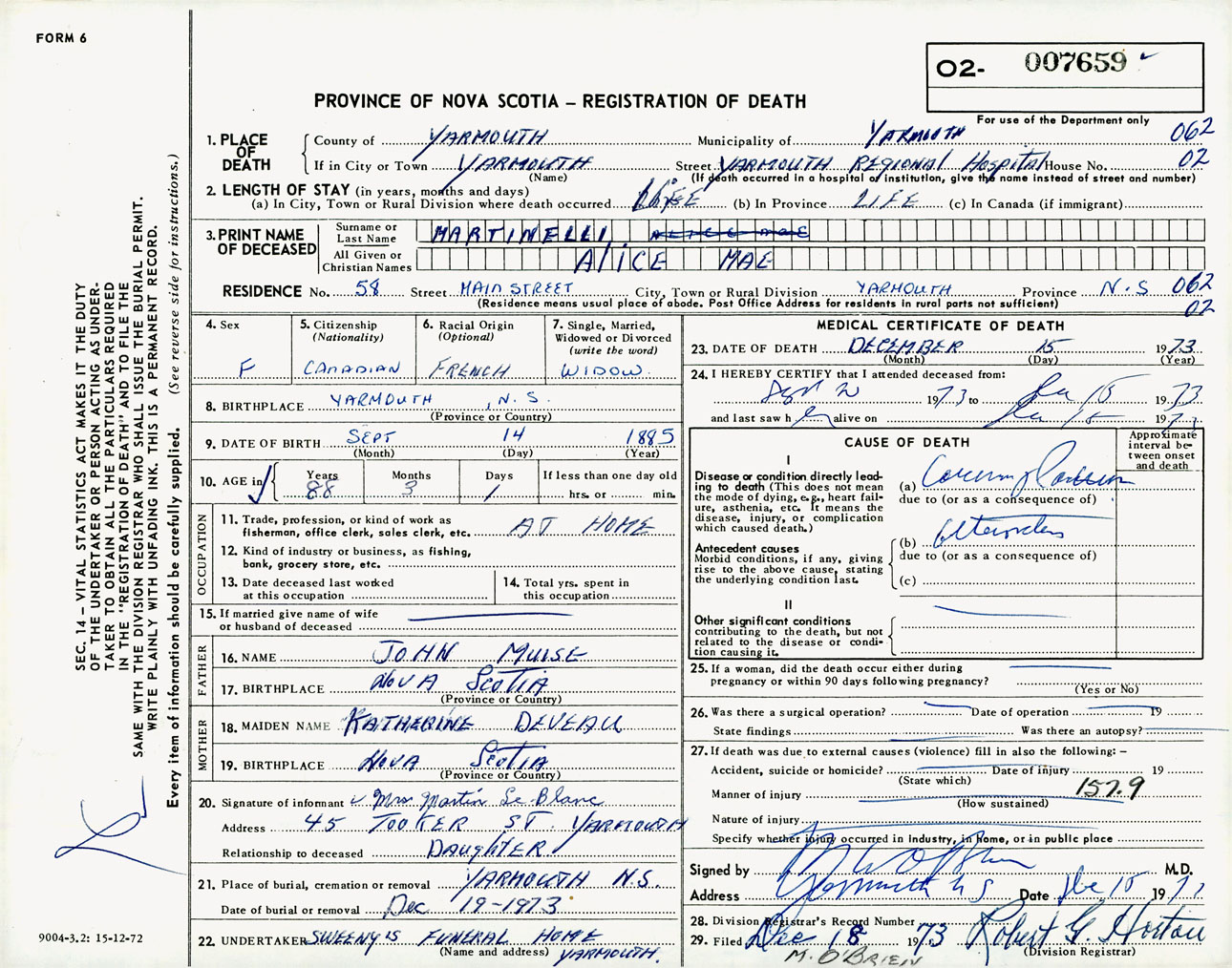 Female Death Registration: Year: 1973 number: 7659