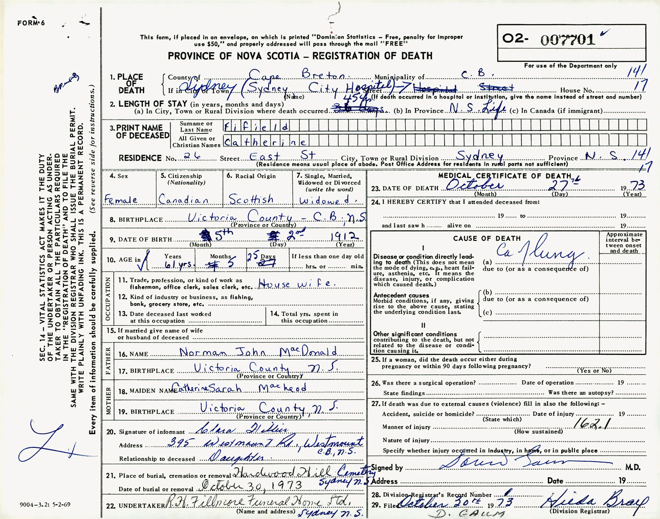 Female Death Registration: Year: 1973 number: 7701