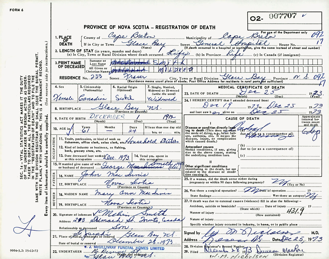 Female Death Registration: Year: 1973 number: 7707