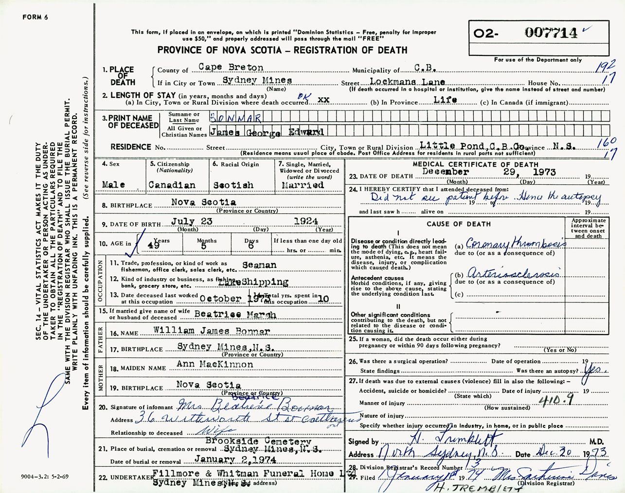Male Death Registration: Year: 1973 number: 7714