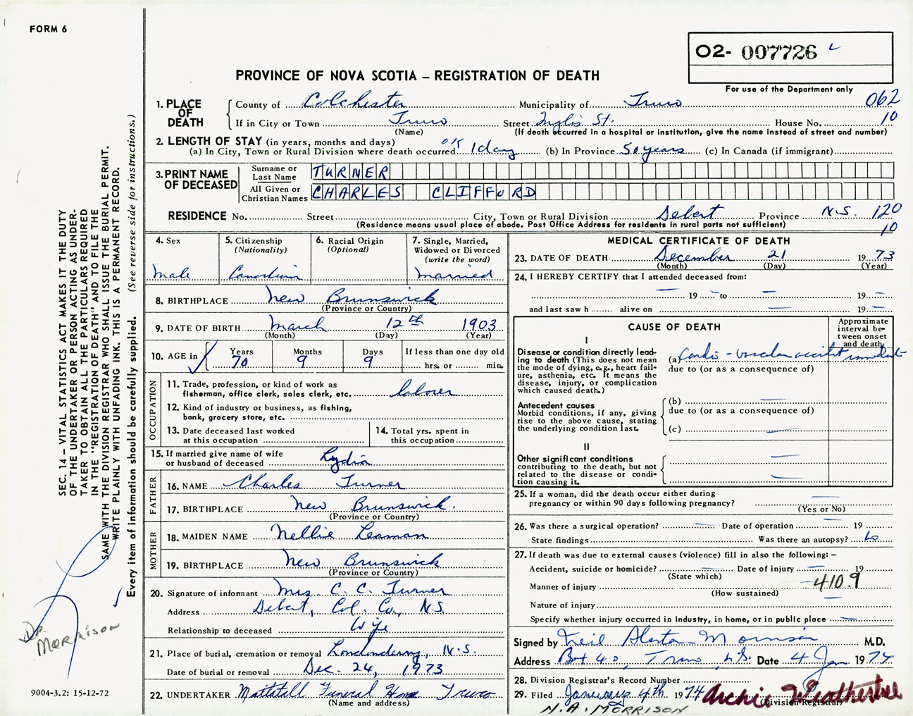 Male Death Registration: Year: 1973 number: 7726