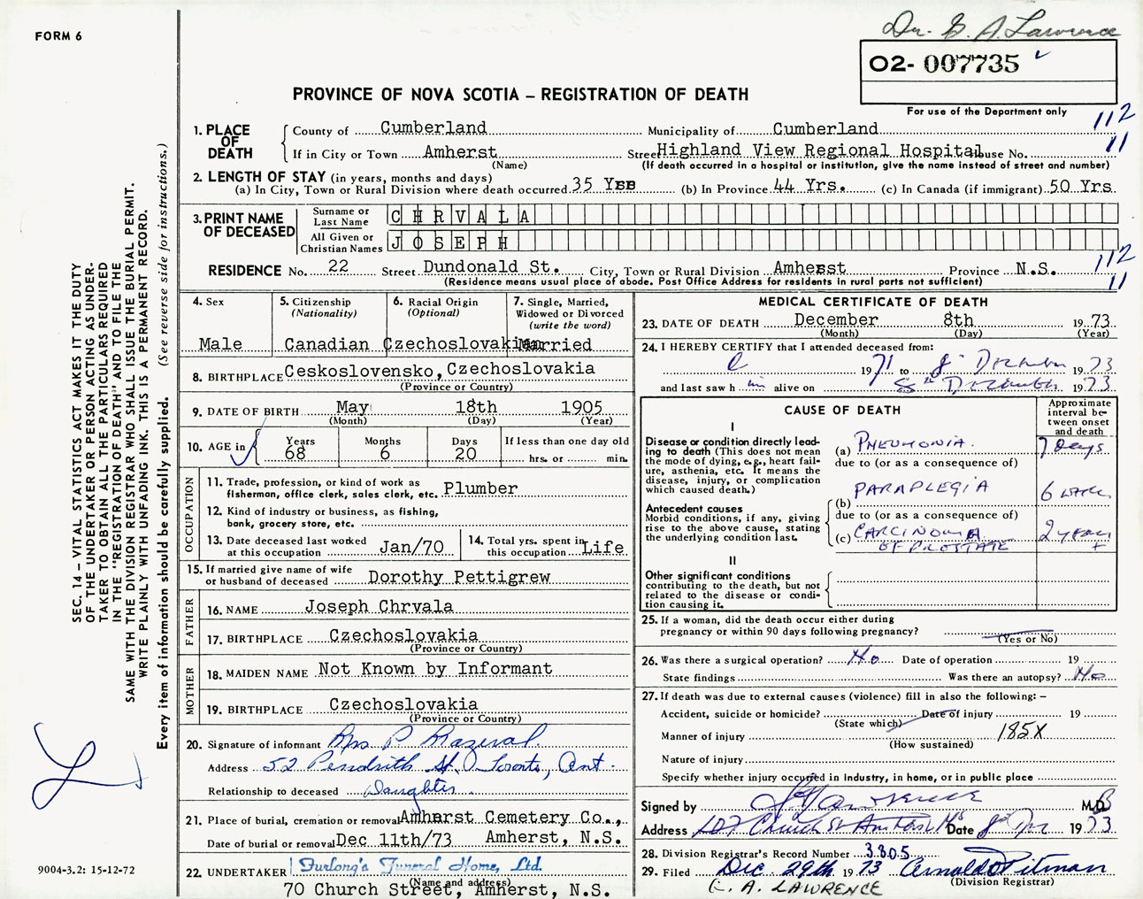 Male Death Registration: Year: 1973 number: 7735