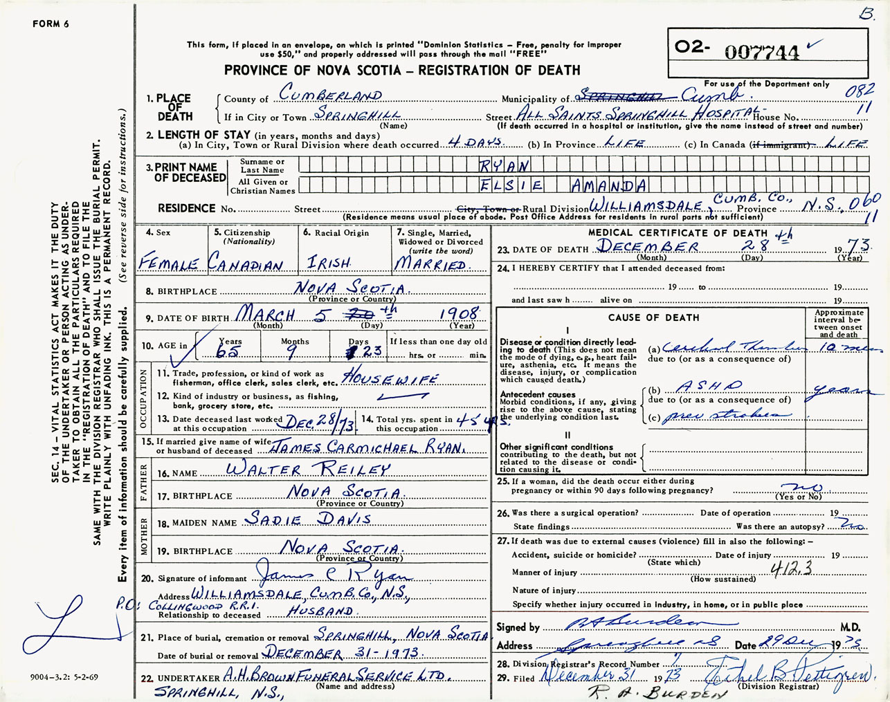 Female Death Registration: Year: 1973 number: 7744