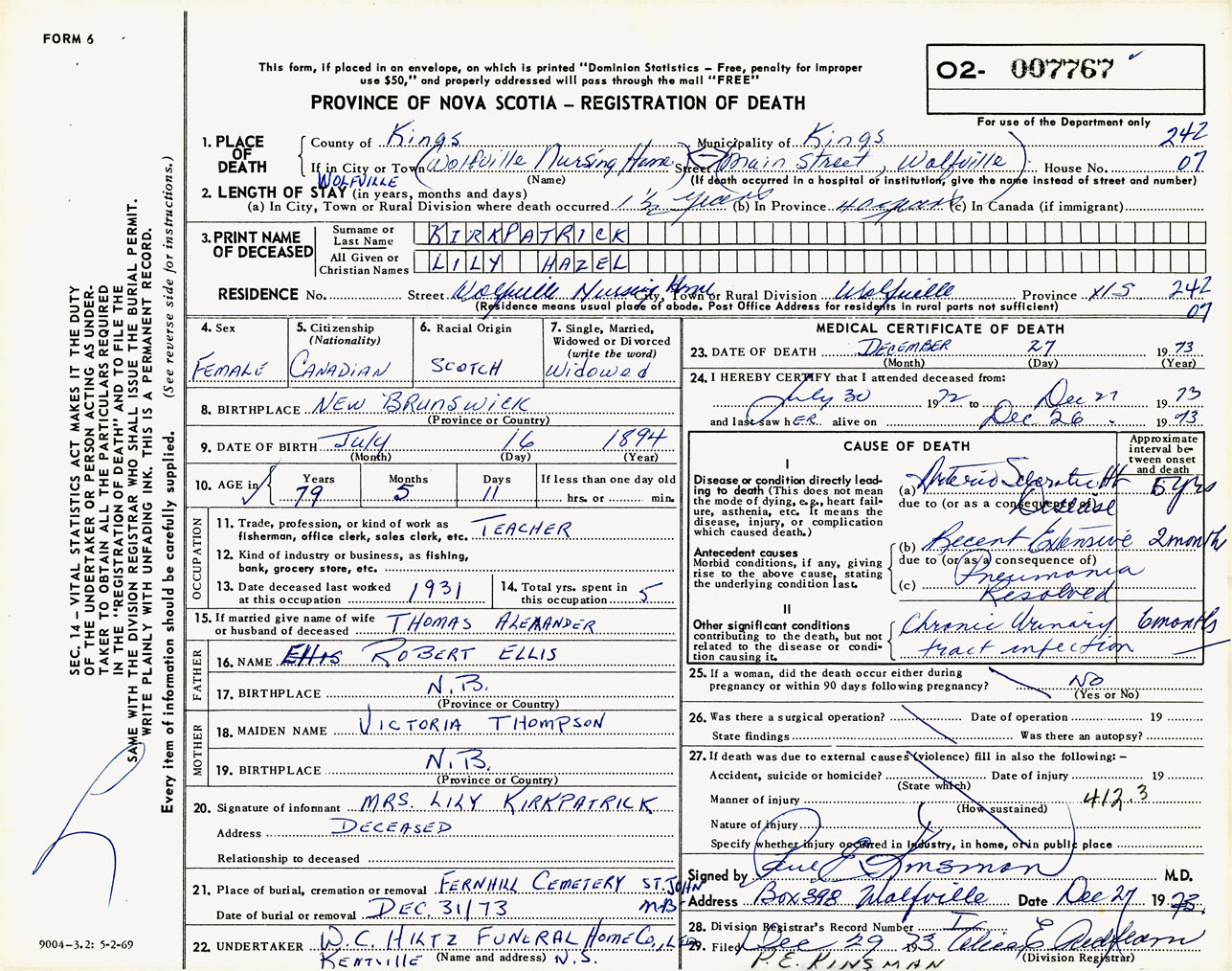 Female Death Registration: Year: 1973 number: 7767
