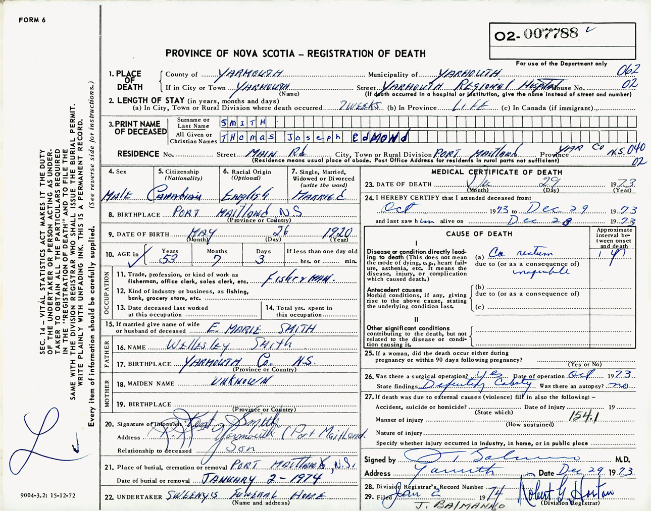 Male Death Registration: Year: 1973 number: 7788