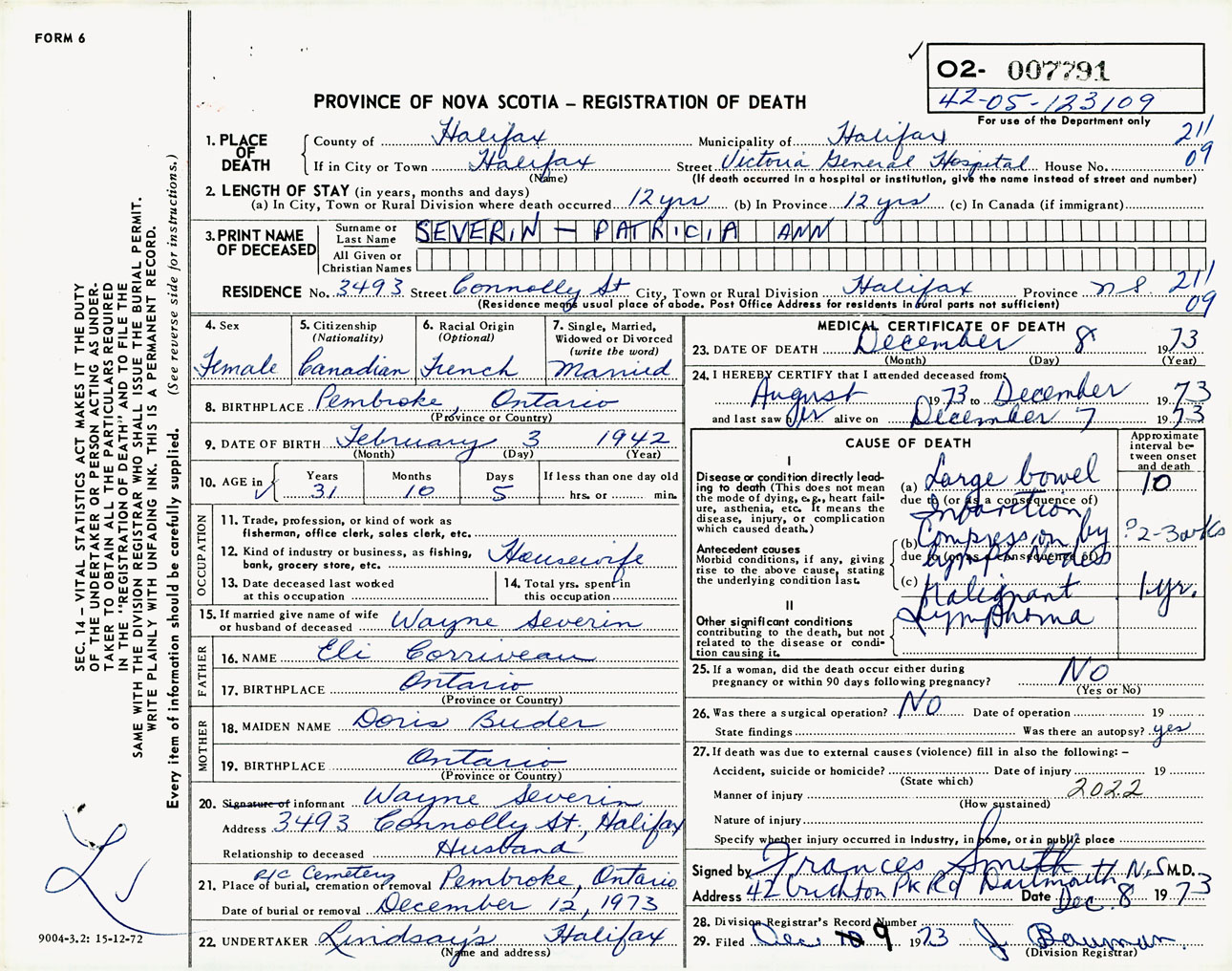 Female Death Registration: Year: 1973 number: 7791