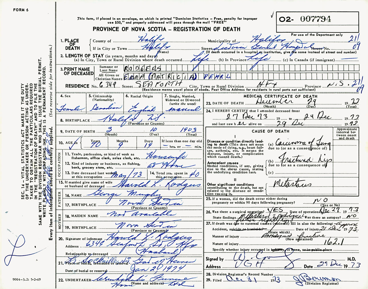 Female Death Registration: Year: 1973 number: 7794