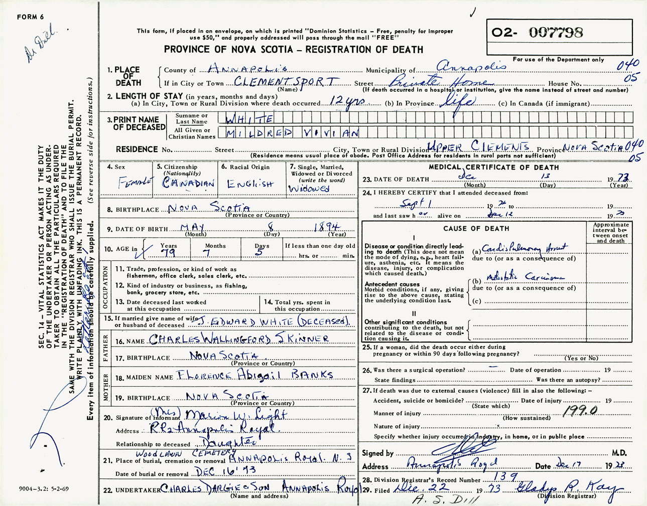 Female Death Registration: Year: 1973 number: 7798