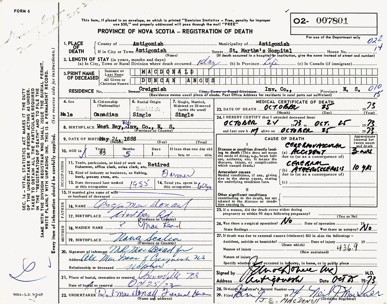 Male Death Registration: Year: 1973 number: 7801