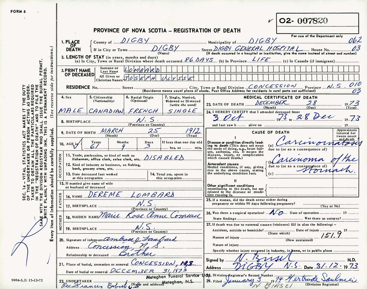Male Death Registration: Year: 1973 number: 7820