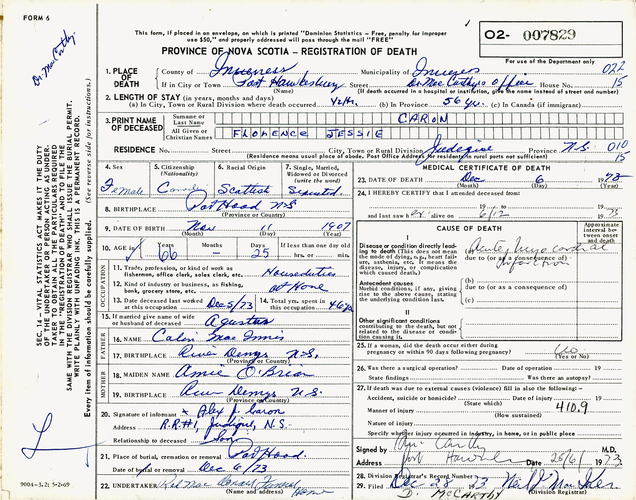 Female Death Registration: Year: 1973 number: 7829