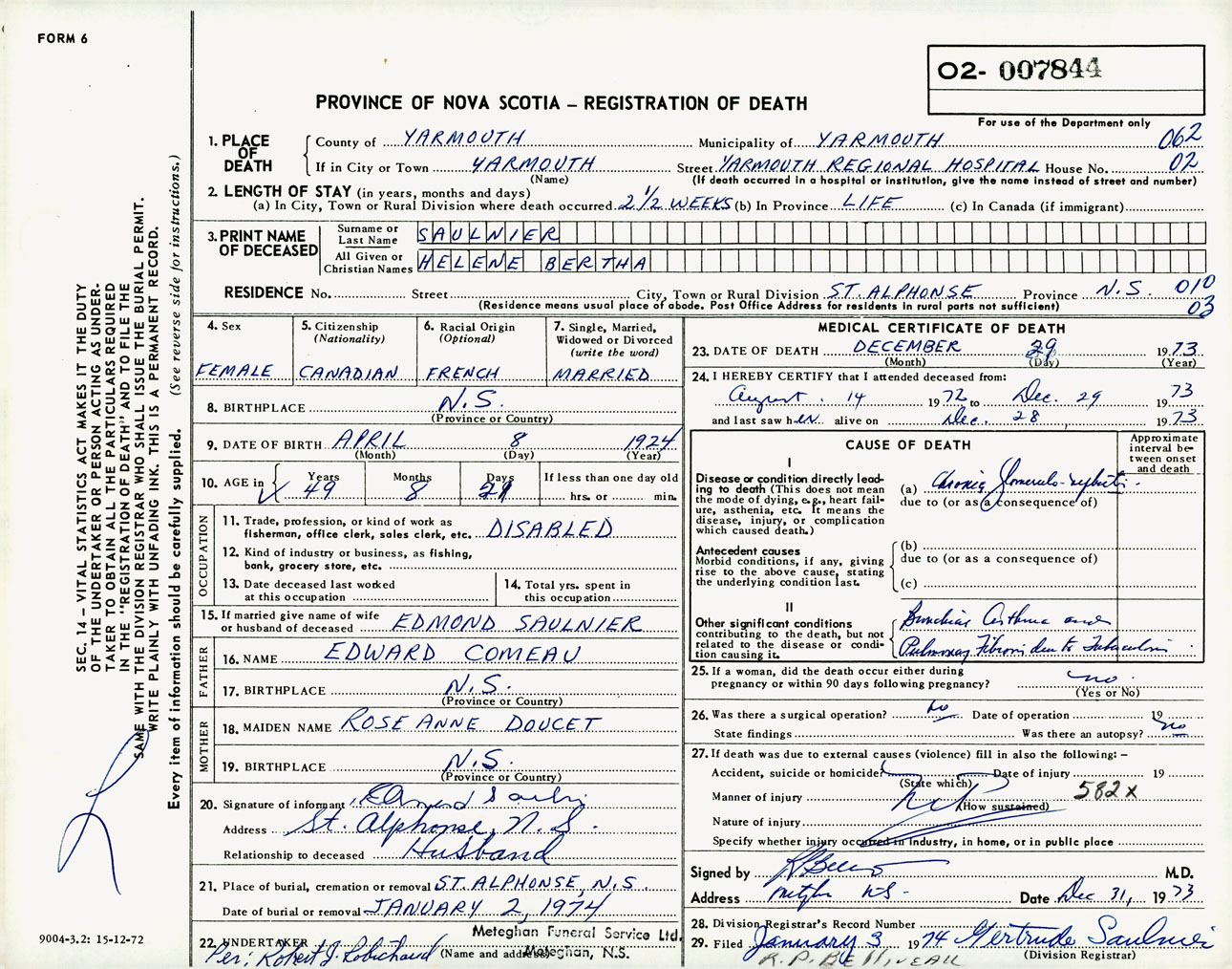 Female Death Registration: Year: 1973 number: 7844