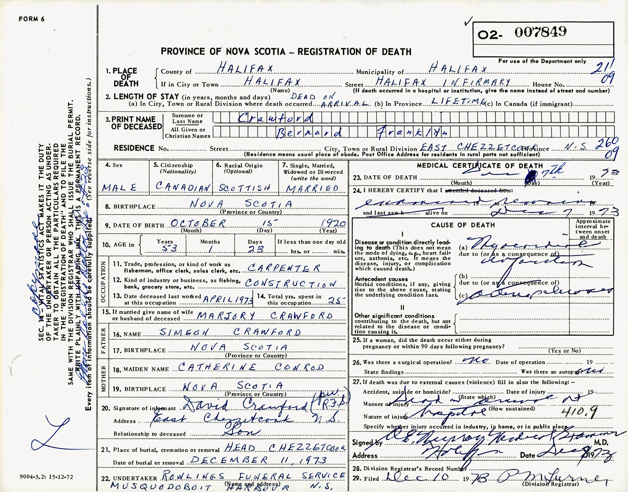 Male Death Registration: Year: 1973 number: 7849