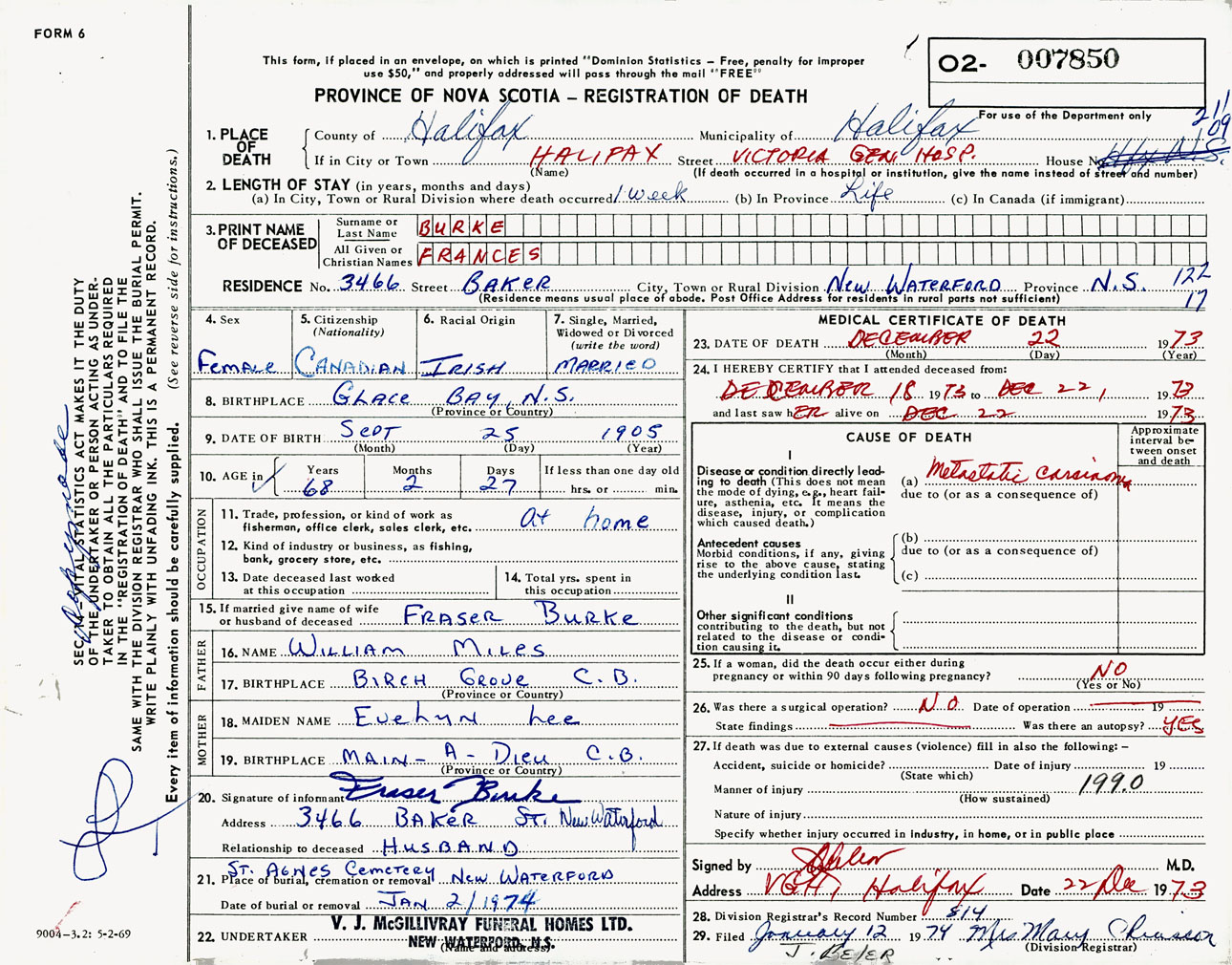 Female Death Registration: Year: 1973 number: 7850