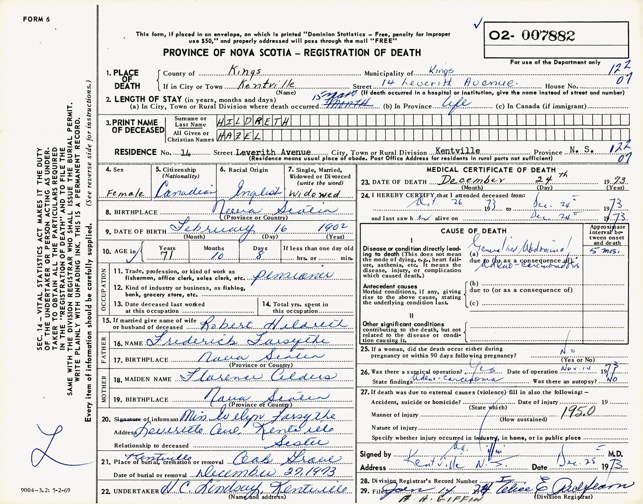 Female Death Registration: Year: 1973 number: 7882