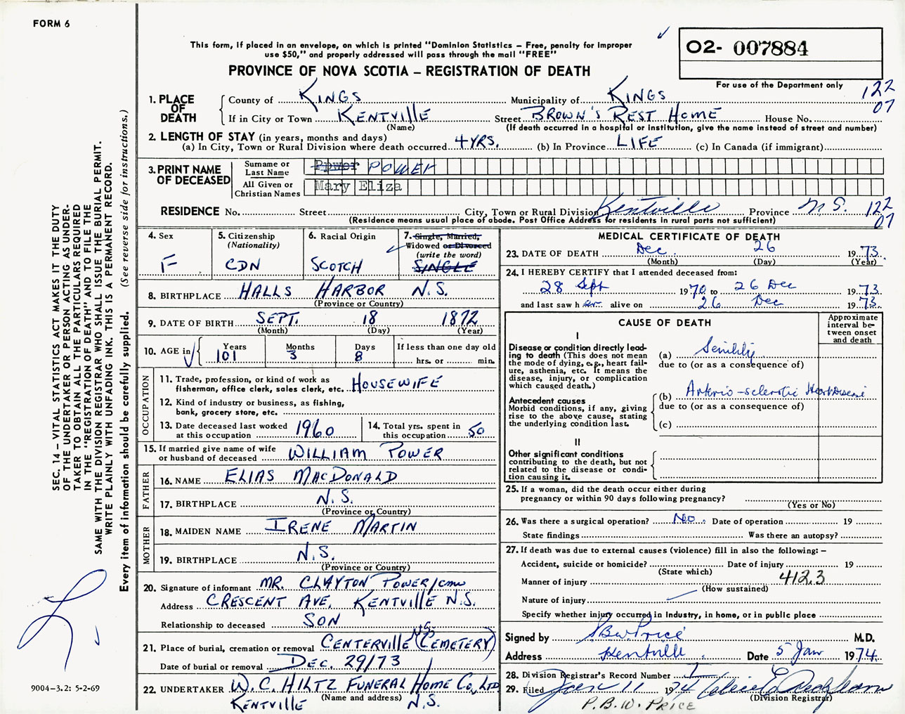 Female Death Registration: Year: 1973 number: 7884