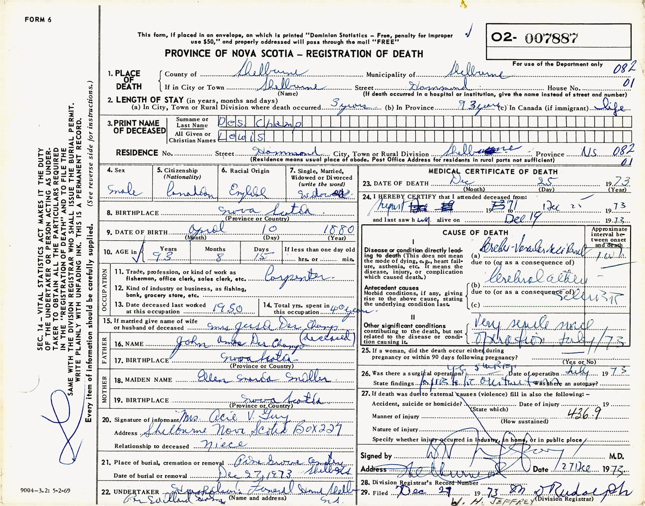 Male Death Registration: Year: 1973 number: 7887