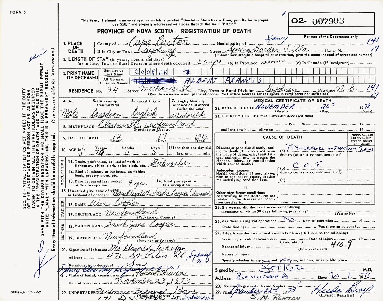 Male Death Registration: Year: 1973 number: 7903