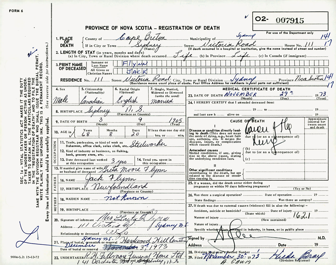 Male Death Registration: Year: 1973 number: 7915