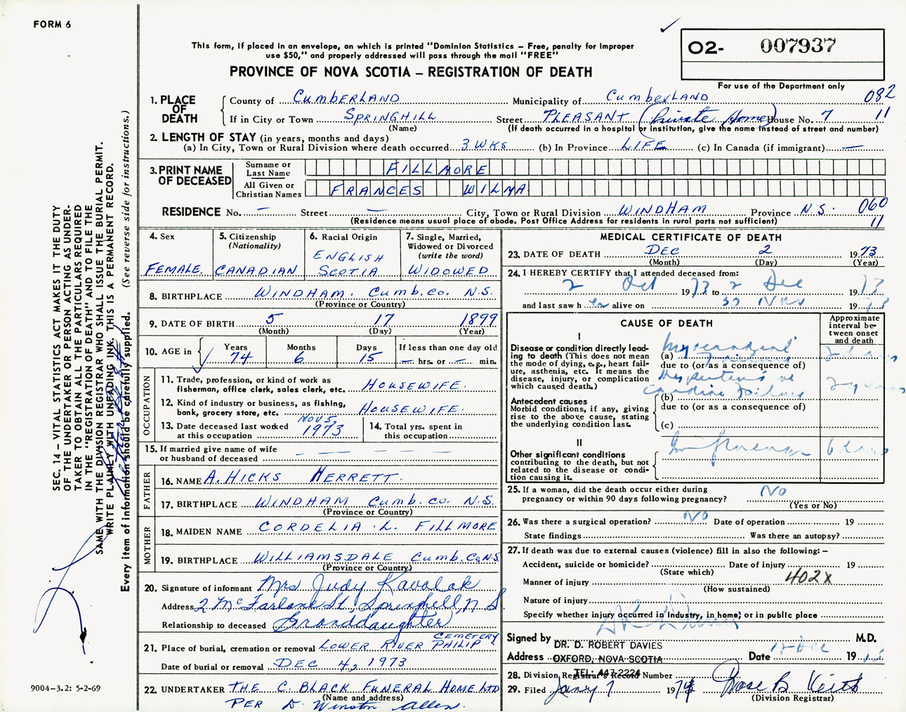 Female Death Registration: Year: 1973 number: 7937