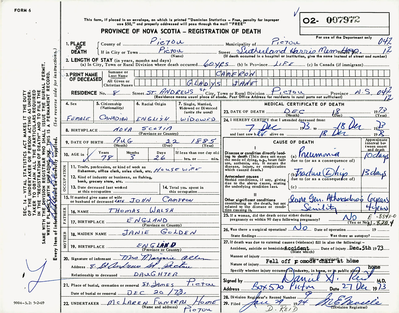 Female Death Registration: Year: 1973 number: 7972