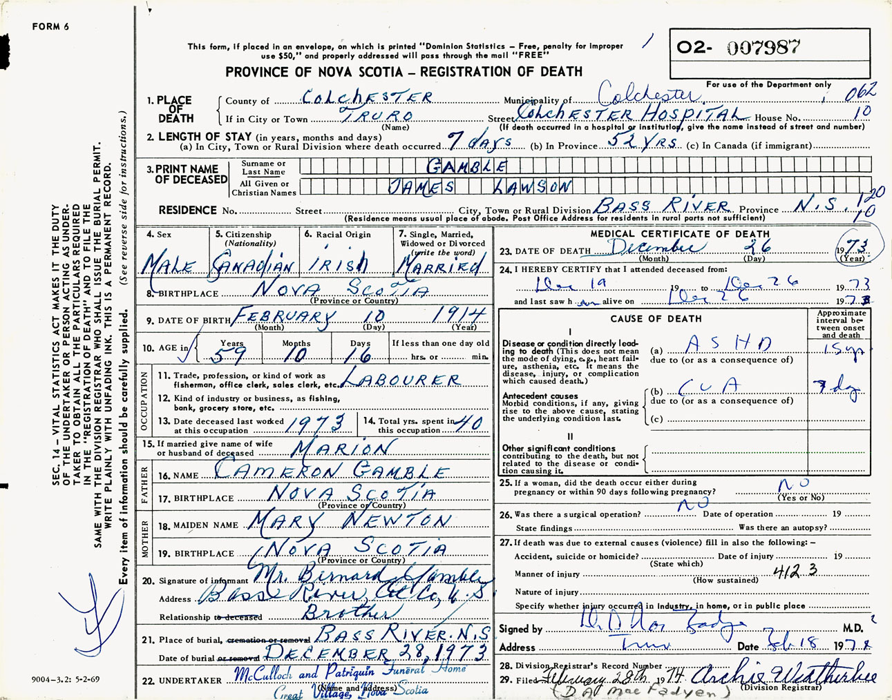 Male Death Registration: Year: 1973 number: 7987
