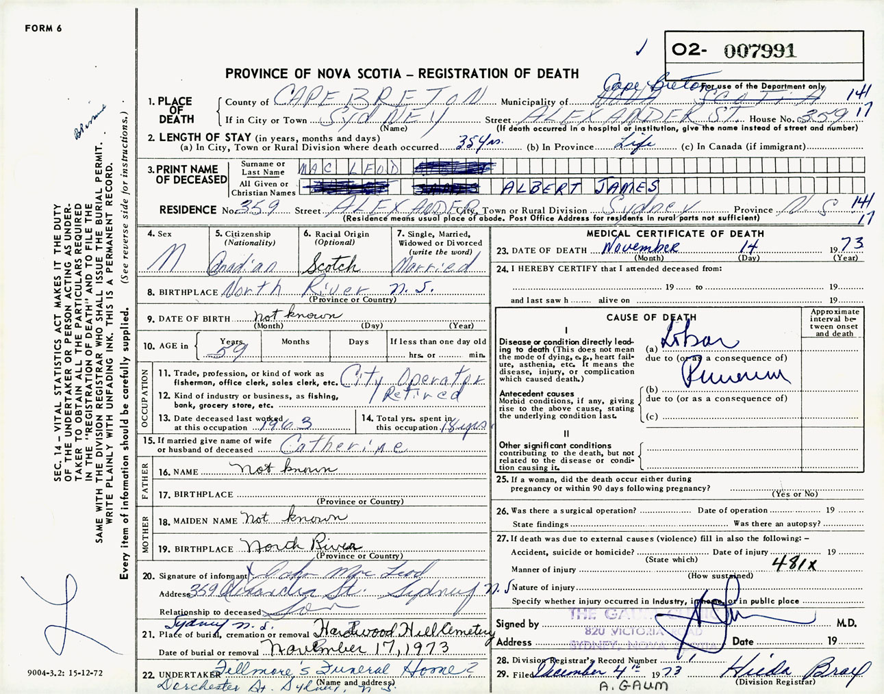 Male Death Registration: Year: 1973 number: 7991