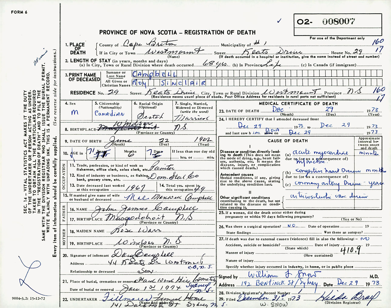 Male Death Registration: Year: 1973 number: 8007