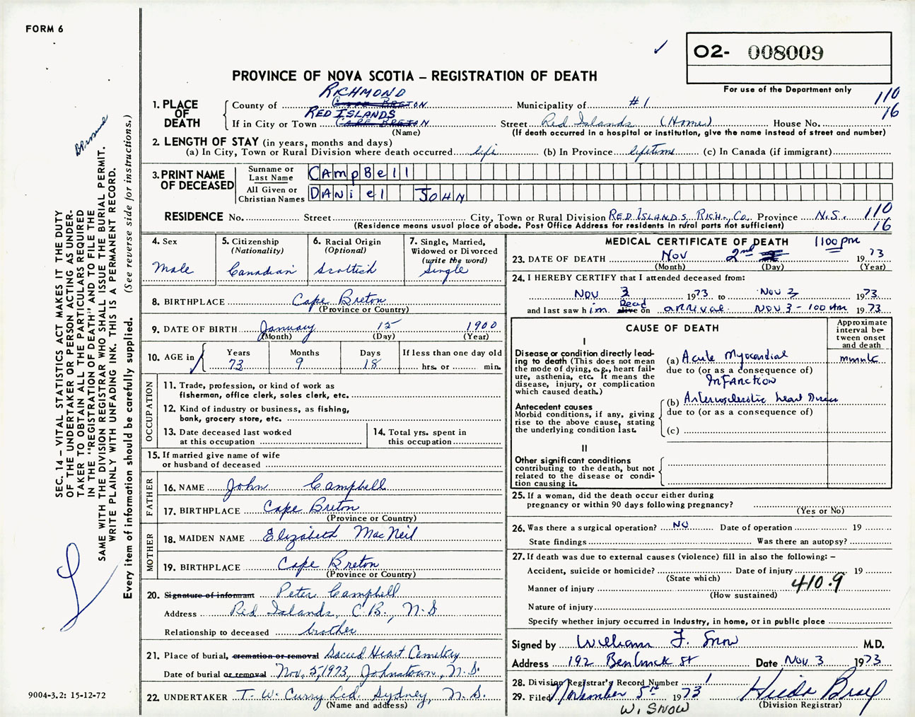 Male Death Registration: Year: 1973 number: 8009