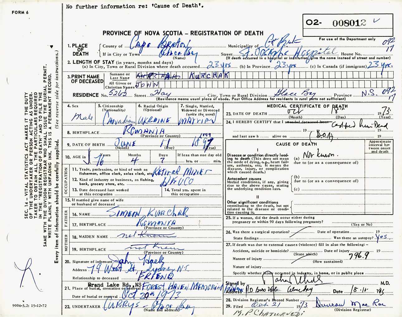 Male Death Registration: Year: 1973 number: 8012