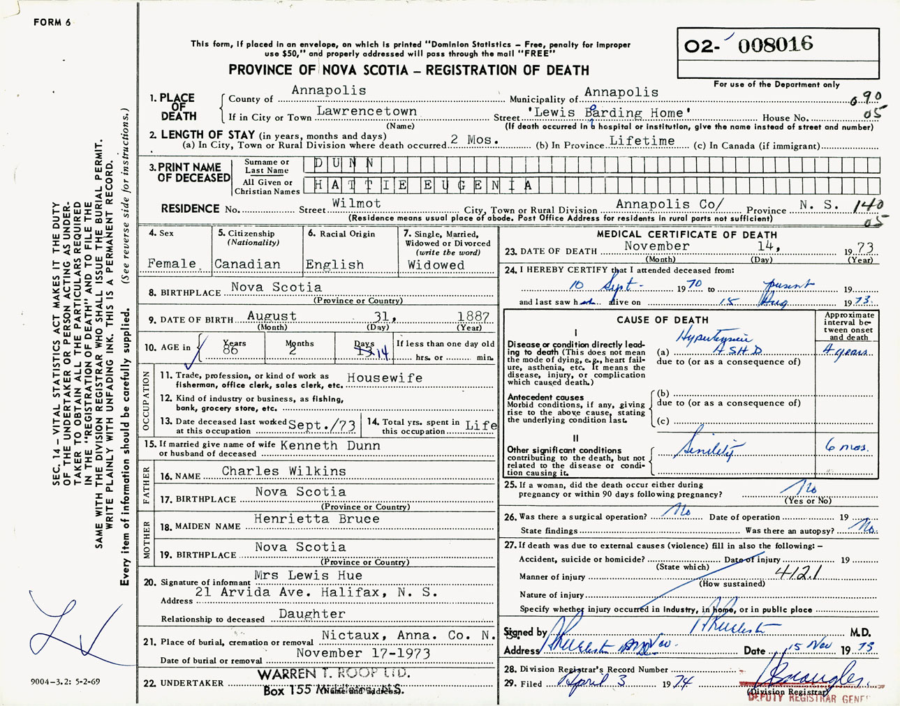 Female Death Registration: Year: 1973 number: 8016