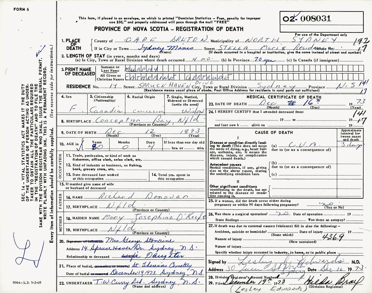 Female Death Registration: Year: 1973 number: 8031