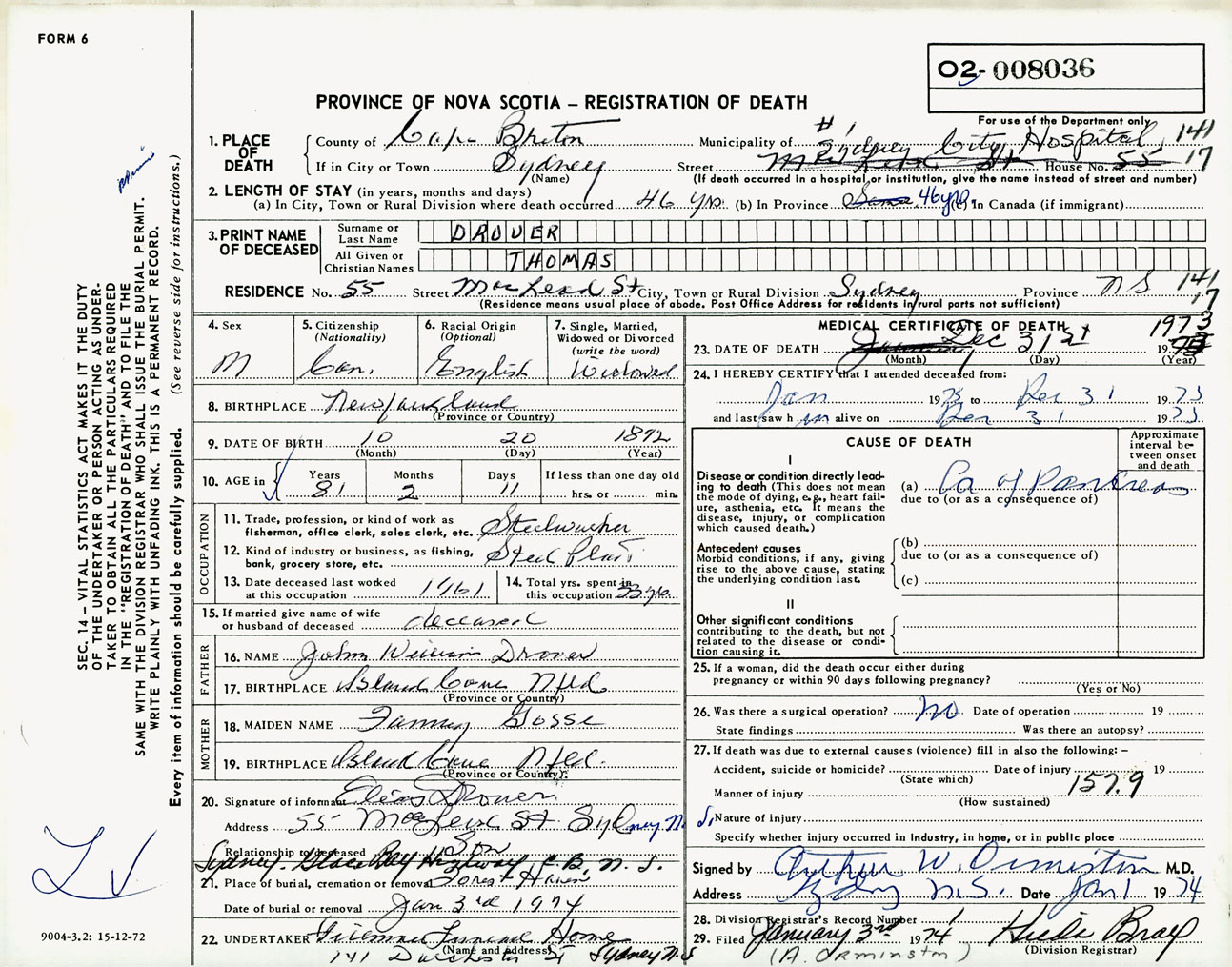 Male Death Registration: Year: 1973 number: 8036