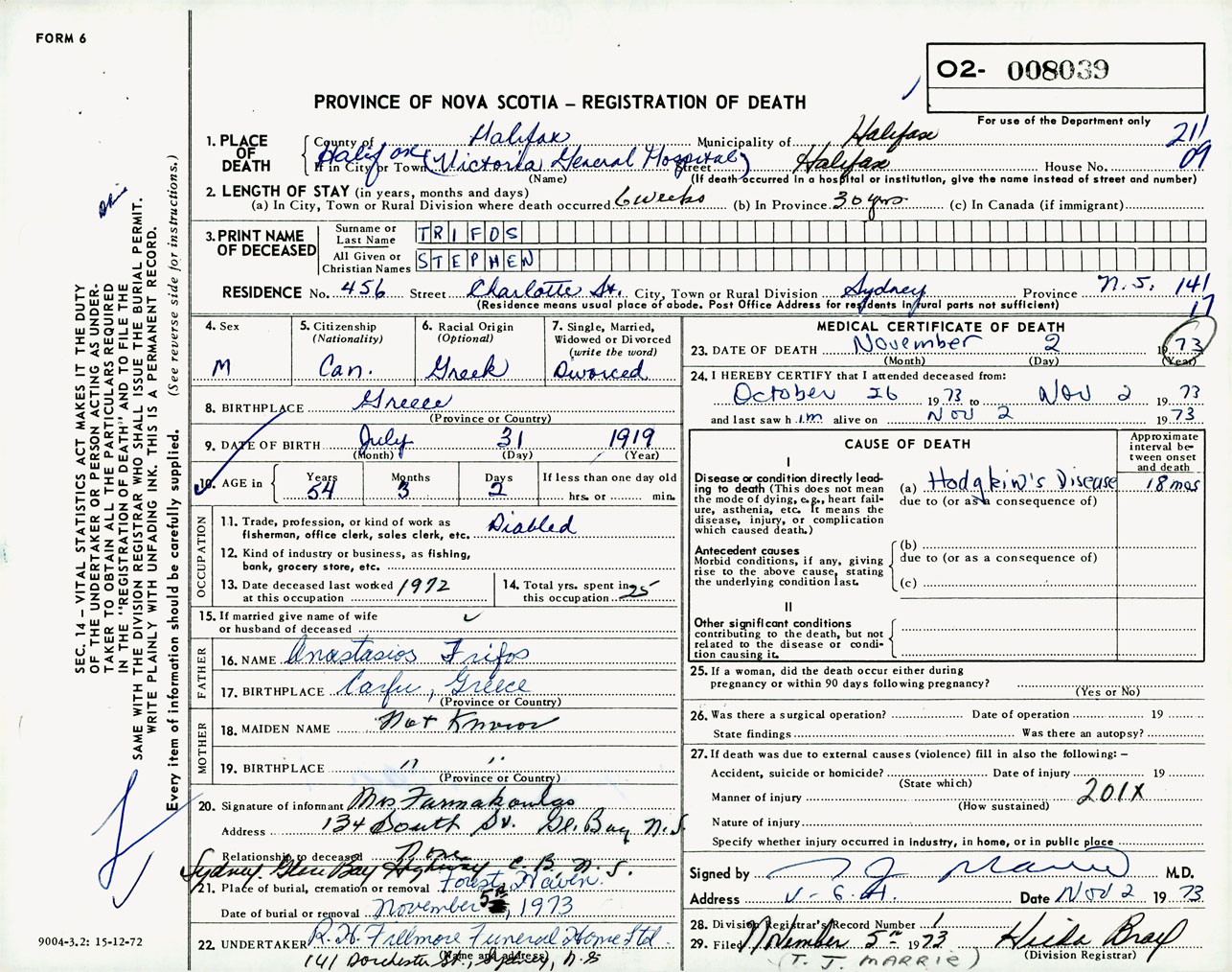 Male Death Registration: Year: 1973 number: 8039