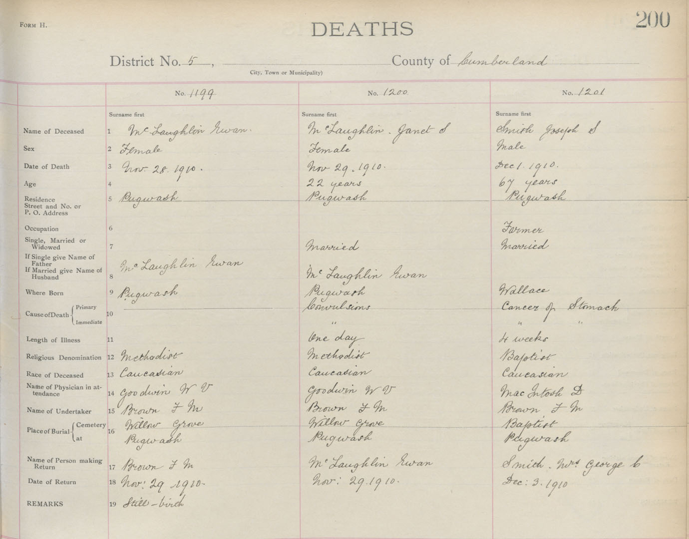 Death Registration: Year: 1910 book: 5 page: 200 number: 1199