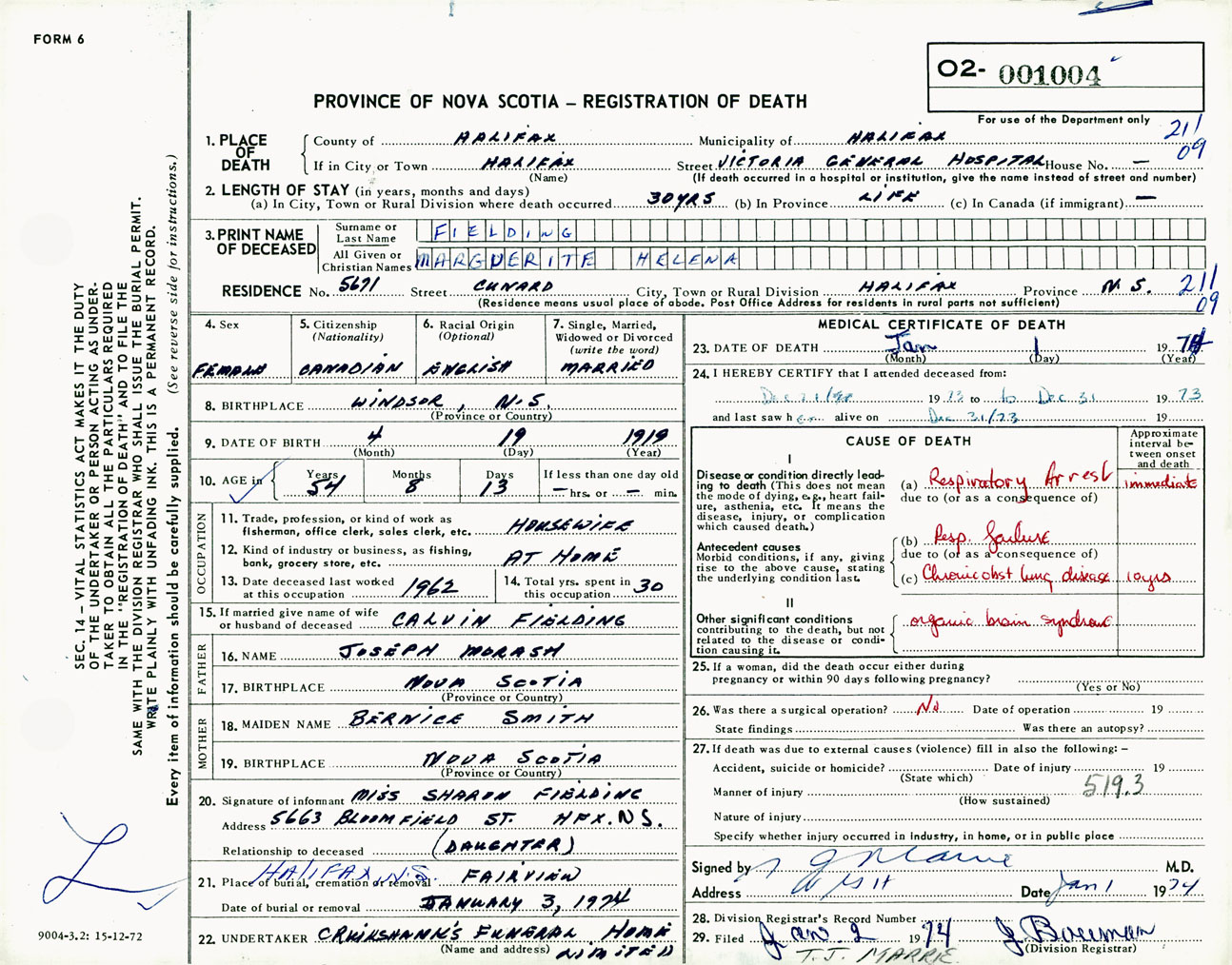Female Death Registration: Year: 1974 number: 1004