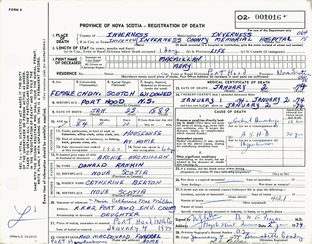 Female Death Registration: Year: 1974 number: 1016