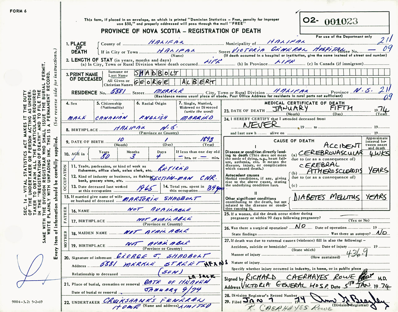 Male Death Registration: Year: 1974 number: 1023